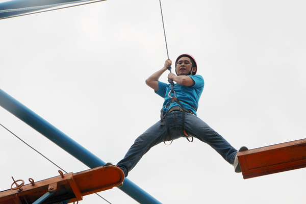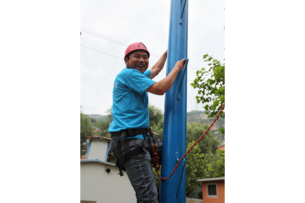 此次拓展訓(xùn)練加大了難度,增加了高空斷橋項(xiàng)目。挑戰(zhàn)人員需自行爬上八米的立柱,從很窄的木板上走過,然后跨越到一米半以外的另一塊木板上,然后從兩塊木板中間跳下。雖然有保險(xiǎn)繩保護(hù),但對(duì)于參與者的心理和體力還是一個(gè)很大的挑戰(zhàn)。