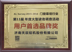 ???? 同期,由中國建筑金屬結(jié)構(gòu)協(xié)會(huì)主辦,中國幕墻網(wǎng)承辦的“第十一屆AL-Survey2015-2016中國幕墻網(wǎng)年度大型讀者調(diào)查評(píng)選活動(dòng)”頒獎(jiǎng)儀式在在廣州廣交會(huì)威斯汀酒店隆重舉行,天辰股份榮獲“用戶首選品牌獎(jiǎng)”。