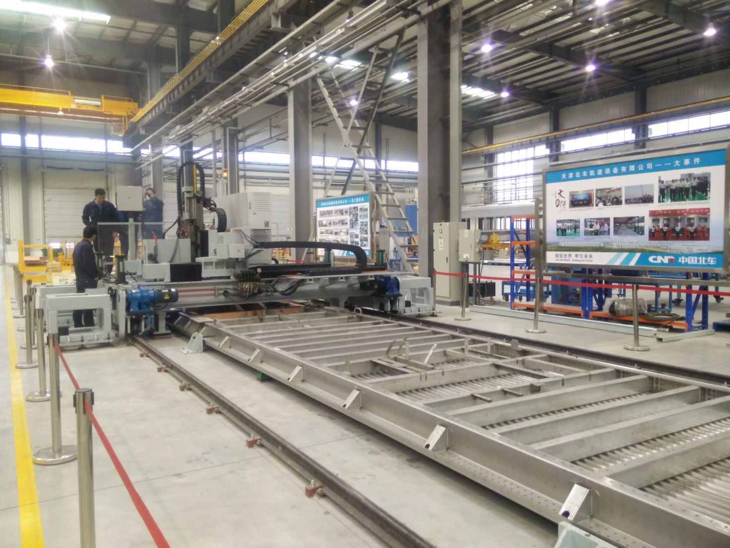 超長數(shù)控四軸龍門加工中心有效加工長度近30米,可實現(xiàn)四軸聯(lián)動加工,并配置12刀位旋轉(zhuǎn)刀庫、大功率HSD高速電主軸及雙端鋸切裝置,主要適用于高鐵等軌道交通車體鋁型材的高速鉆銑、鋸切加工;數(shù)控鉆銑中心采用框架式龍門結(jié)構,機床剛性好,可完成復雜三軸聯(lián)動加工,適合碳鋼、高強度不銹鋼等車體的高效粗、精加工,主要用于軌道交通車輛底架與轉(zhuǎn)向架連接處的平面、定位孔等工序的加工,具備銑削、鉆削、鏜孔及攻螺紋等功能。